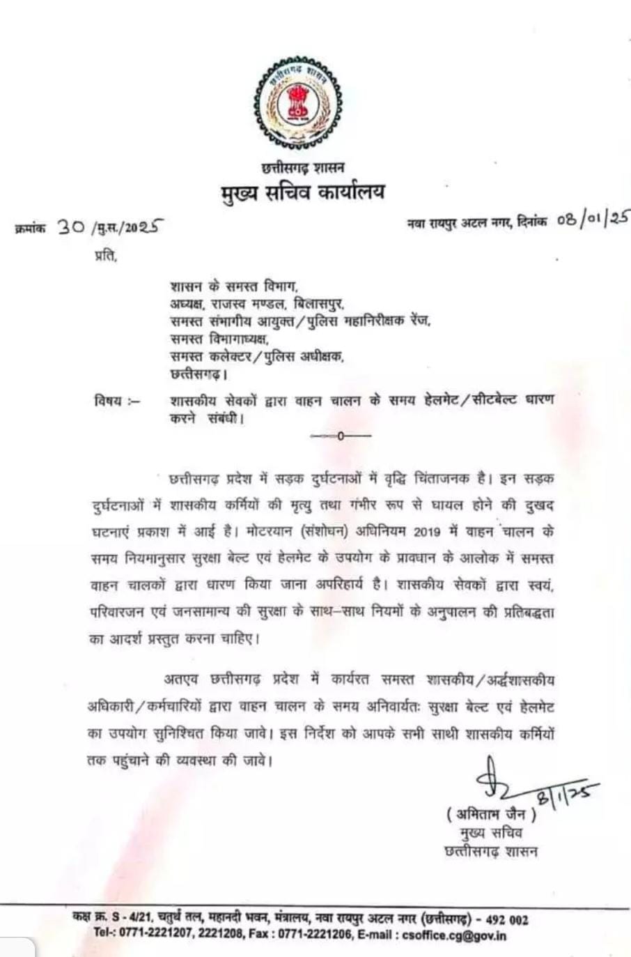 छत्तीसगढ़ के मुख्य सचिव अमिताभ जैन ने सभी विभागाध्यक्षों, आईजी, कमिश्नर, कलेक्टर और एसपी को निर्देश जारी किए हैं, जिसमें शासकीय अधिकारियों और कर्मचारियों के लिए वाहन चलाते समय सीट बेल्ट और हेलमेट का उपयोग अनिवार्य किया गया है। यह कदम सड़क दुर्घटनाओं में शासकीय कर्मचारियों की मौत पर चिंता जताते हुए उठाया गया है। मुख्य सचिव ने सभी जिलों के कलेक्टरों और पुलिस अधीक्षकों को सड़क दुर्घटनाओं के कारणों की समीक्षा करने और सुधारात्मक उपाय करने के निर्देश भी दिए हैं। उन्होंने विशेष रूप से उन स्थानों की पहचान करने पर जोर दिया है, जहां दुर्घटनाएं अधिक होती हैं, ताकि आवश्यक कार्यवाही की जा सके। इसके अलावा, शासकीय कर्मचारियों से अपेक्षा की गई है कि वे हेलमेट और सीट बेल्ट का स्वयं उपयोग कर आम नागरिकों को प्रेरित करें।