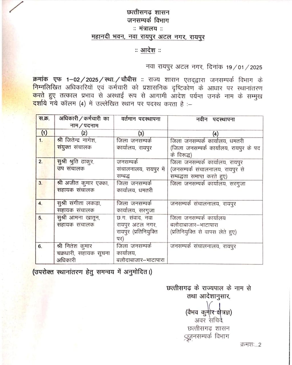 प्रदेश में नगरी निकाय और त्रिस्तरीय पंचायत चुनाव के पहले जनसंपर्क अधिकारियों का तबादला किए जाने की प्रक्रिया चुनावी तैयारियों का हिस्सा है। चुनावी आचार संहिता लागू होने से पहले यह कदम प्रशासनिक दृष्टि से आमतौर पर उठाया जाता है, ताकि चुनावी कार्यों में पारदर्शिता और निष्पक्षता सुनिश्चित की जा सके। जनसंपर्क अधिकारियों के तबादले से संबंधित 6 जिलों में हुए बदलावों का उद्देश्य चुनाव के दौरान सही जानकारी और सूचना का प्रसार करना है।