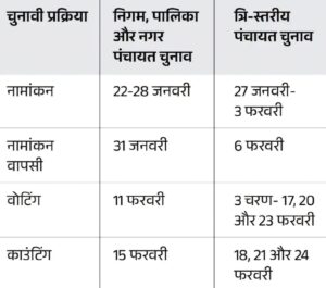 राज्य निर्वाचन आयुक्त अजय सिंह ने बताया है कि नगरीय निकायों का चुनाव जहां एक दिन संपन्न हो जाएगा वहीं त्रिस्तरीय पंचायत चुनावों को तीन चरण में कराया जाएगा। निकायों का मतदान 11 फरवरी को होगा और रिजल्ट 15 फरवरी को मतगणना के बाद आ जाएगा वहीं त्रिस्तरीय चुनाव 17, 20 और 23 फरवरी को होगा और इनका रिजल्ट क्रमशः 18, 21 और 24 फरवरी को आएगा।