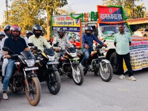मंगलवार को अपर कलेक्टर गजेंद्र ठाकुर के द्वारा यातायात शिक्षा एवं सड़क सुरक्षा जागरूकता अभियान के तहत लोगों को हेलमेट वितरित कर यातायात नियमों का पालन करने प्रेरित किया। उन्होंने दोपहिया वाहन चालकों को हेलमेट लगाने और यातायात नियमों के तहत रोड सेफ्टी नियमों का कड़ाई से पालन करने की सीख दी। इस अवसर पर यातायात जागरूकता रथ को रवाना किया गया।