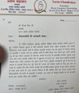 कांग्रेस में प्रत्याशी चयन को लेकर जारी बैठकों के बीच भितरघात के आरोपों ने राजनीतिक हलचल बढ़ा दी है. राजधानी रायपुर में अरविंद दिक्षित ब्लॉक कांग्रेस के अध्यक्ष नवीन चंद्राकर ने पीसीसी अध्यक्ष को एक पत्र लिखकर भितरघातियों की दावेदारी पर विचार न करने का आग्रह किया है. इस पत्र के बाद कांग्रेस में खलबली मच गई है.