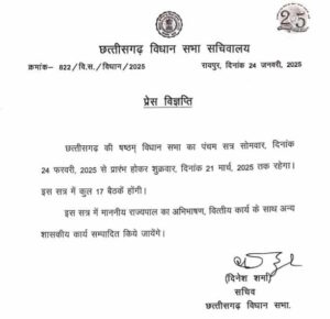 छत्तीसगढ़ विधानसभा का बजट सत्र (पंचम सत्र) 24 फरवरी से शुरू होकर 21 मार्च तक चलेगा. सत्र के दौरान कुल 17 बैठकें होंगी. सत्र के दौरान वित्तीय कार्य के साथ-साथ अन्य शासकीय कार्य संपादित किए जाएंगे.