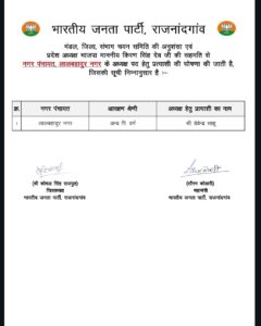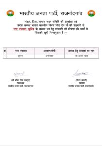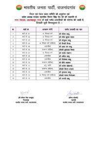 नगरीय निकाय चुनाव के लिए भाजपा ने प्रत्याशियों की पहली सूची जारी कर दी है. बीजेपी की पहली लिस्ट में राजनांदगांव जिले के छुरिया, एलबी नगर और डोंगरगढ़ नगर पालिका के पार्षद प्रत्याशियों का लिस्ट जारी किया है.