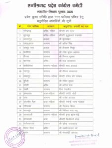 रायपुर। काँग्रेस पार्टी ने भी निकाय के प्रत्याशियों की सूची जारी कर दी है। नगर पंचायत अध्यक्ष औऱ नगरपालिका चेयरमैन के प्रत्याशियों की घोषणा कर दीगयी है। इनमे जशपुर जिले के भी सभी सीट शामिल है।
