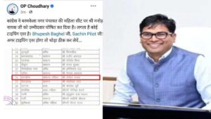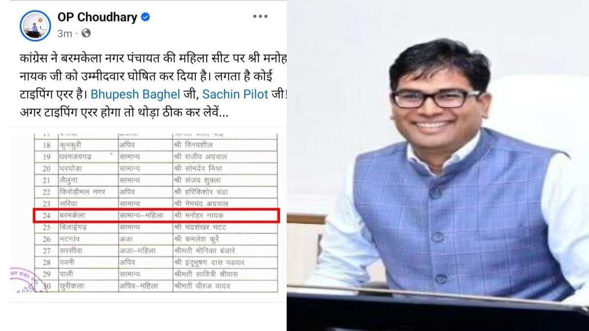 उन्होंने अपने सोशल मीडिया एक्स पर कांग्रेस प्रत्याशियों की सूची साझा करते हुए लिखा कि कांग्रेस ने बरमकेला नगर पंचायत की महिला सीट पर मनोहर नायक को उम्मीदवार घोषित कर दिया है. लगता है कोई टाइपिंग एरर है. वित्त मंत्री चौधरी ने इसके लिए पूर्व मुख्यमंत्री भुपेश बघेल और कांग्रेस प्रदेश प्रभारी सचिन पायलट को टैग करते हुए लिखा कि अगर टाइपिंग एरर होगा तो थोड़ा ठीक कर लेवें.