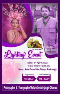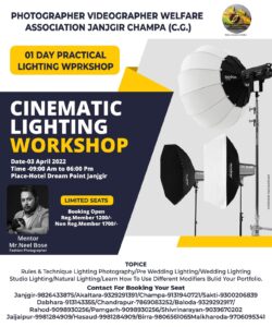 जांजगीर-चांपा। फोटोग्राफी और वीडियोग्राफी के शौकीन लोगों के लिए जिले के फोटोग्राफर वीडियोग्राफर वेलफेयर एसोसिएशन द्वारा 3 अप्रैल को जांजगीर स्थित होटल ड्रीम प्वाइंट में एक दिवसीय लाइट इवेंट का आयोजन रखा गया है।