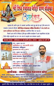 तीन दिन तक चलने वाले धार्मिक कार्यक्रम को सफल बनाने समस्त मोहल्लेवासी एवं शिव भक्त लगे हुए है। श्री शिव पंचायत मंदिर के स्थापना अवसर पर उपस्थित होकर अपना जीवन धन्य बनाने आयोजकों ने अपील की है।