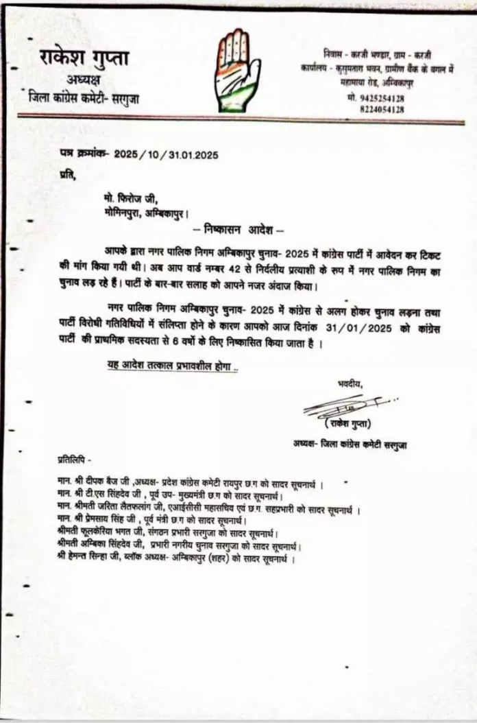 छत्तीसगढ़ में कांग्रेस ने बागी प्रत्याशियों के खिलाफ कार्रवाई शुरू कर दी है. सरगुजा जिले में निर्दलीय चुनाव लड़ रहे 3 कांग्रेसियों को पार्टी ने बाहर का रास्ता दिया दिया है. जिला अध्यक्ष राकेश गुप्ता ने अशोक जायसवाल, अब्दुल रशीद और फिरोज को कांग्रेस से निष्काषित कर दिया है. ये तीनों कांग्रेस के अधिकृत प्रत्याशी होने के बावजूद पार्षद का चुनाव लड़ रहे हैं