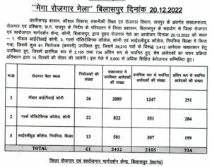 आठ हजार से 45 हजार रूपए की तनख्वाह वाले इन पदों के लिए शैक्षणिक योग्यता आठवीं से अधिक रखी गयी थी। बेरोजगार युवाओं ने इस प्रकार के आयोजन को रोजगार पाने का सुनहरा अवसर बताया । मेले में बिलासपुर की सुश्री अनुसूईया लहरे ने बताया कि उन्होंने अन्नपूर्णा फाइनेंस कंपनी के लिए आवेदन किया । गौरेला पेण्ड्रा मारवाही जिले से आए सूर्या साहू ने बताया कि रोजगार के लिए काफी समय से परेशान रहने के बाद इस आयोजन से उन्हें बहुत राहत मिली है। सेंदरी से आई श्रीमती रूखमणी चौहान ने इस प्रकार के आयोजन को बेरोजगाारों के लिए उपयोगी बताया। रोजगार मेले में पात्रा इंडिया कंपनी के एच.आर. मैनेजर विकास त्रिपाठी ने बताया कि उनकी कंपनी इंश्योरेंस के क्षेत्र में काम कर रही है। उनकी कंपनी बैक आफिस में कार्य करने वाले युवाओं की तलाश है जिसके लिए उन्होंने न्यूनतम योग्यता स्नातक रखी है। उनकी कंपनी 14 हजार न्यूनतम वेतन देगी।