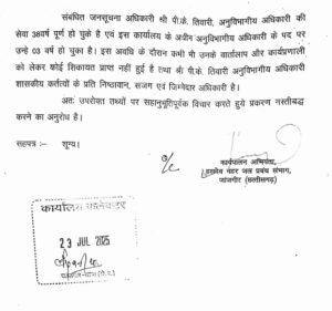 उपरोक्त विषयांतर्गत प्रार्थी द्वारा शिकायत प्रधानमंत्री कार्यालय में की गई है। इस संबंध में कार्यालय अनुविभागीय अधिकारी, जांजगीर शाखा नहर उपसंभाग क्र. 01. जांजगीर से प्राप्त शिकायत के जवाब में दिये गये तथ्यों के संबंध में अधोहस्ताक्षरकर्ता द्वारा परीक्षण किया गया, जिसमें पाया गया कि आवेदनकर्ता को गलतफहमी हुई कि जनसूचना अधिकारी द्वारा उनके साथ अशोभनीय और अमर्यादित व्यवहार किया। वहीं कार्यालय के अन्य 02 स्टाफ संतोष कुमार स्वर्णकार एवं संदीप शर्मा से भी पूछताछ कर वस्तुस्थिति की जानकारी ली गई है जिस पर बताया गया कि दस्तावेजों के अवलोकन के दौरान हाथ में मोबाईल रखे होने के कारण एवं फोटो लेने की गलतफहमी हुई है। इस संबंध में प्रार्थी से दिनांक 08 जुलाई 2025 को सम्पर्क करने की कोशिश की गई पर उनका मोबाईल बंद पाया गया। आवेदक द्वारा सूचना के अधिकार के तहत चाही गई जानकारी उनको नियमानुसार प्रदाय करने के लिये अधोहस्ताक्षरकर्ता एवं उनके अधिनस्थ कार्यालय के जनसूचना अधिकारी का दायित्व है। जनसूचना अधिकारी एवं आवेदक के बीच गलतफहमी तथा वार्तालाप के अभाव में की गई शिकायत पर किसी जिम्मेदार पद पर बैठे अधिकारी पर कार्यवाही करना, प्रथम दृष्टया नजर अंदाज एवं क्षमा करने योग्य है। संबंधित जनसूचना अधिकारी पी.के. तिवारी, अनुविभागीय अधिकारी की सेवा 38 वर्ष पूर्ण हो चुके है एवं इस कार्यालय के अधीन अनुविभागीय अधिकारी के पद पर उन्हे 03 वर्ष हो चुका है। इस अवधि के दौरान कभी भी उनके वार्तालाप और कार्यप्रप्रणाली को लेकर कोई शिकायत प्राप्त नहीं हुई है तथा पी. के. तिवारी अनुविभागीय अधिकारी शासकीय कर्तत्यों के प्रति निष्ठावान, सजग एवं जिम्मेदार अधिकारी है। अतः उपरोक्त तथ्यों पर सहानुभूतिपूर्वक विचार करते हुये प्रकरण नस्तीबद्ध करने का अनुरोध है।