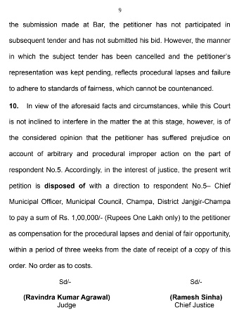 बहरहाल न्यायालय के आदेश पर चांपा नगर पालिका परिषद के मुख्य नगर पालिका अधिकारी को याचिकाकर्ता को 1 लाख मुआवजा देने का आदेश दिया गया है। वही सूत्रों के अनुसार अन्य निविदा के प्रकरण के लिए भी मुख्य नगर पालिका अधिकारी को याचिकाकर्ता को मुआवजा देने का आदेश आ सकता है। इन प्रकरणों को देखते हुए यह प्रतीत हो रहा है कि चांपा के वर्तमान सीएमओ देश के किसी ऊंचे सम्मान के हकदार हो सकते हैं।