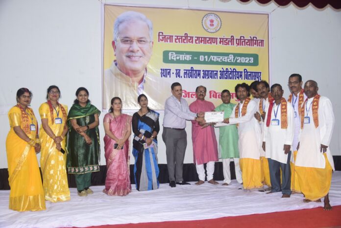 बिलासपुर। भगवान श्री रामचंद्र जी के आदर्शाें को जन-जन तक पहुंचाने के लिए मुख्यमंत्री भूपेश बघेल के निर्देशानुसार जिला स्तरीय रामायण मंडली प्रतियोगिता का आयोजन आज यहां स्व. लखीराम ऑडिटोरियम में संपन्न हुआ। जिला स्तरीय प्रतियोगिता में बिल्हा की भजनामृत मानस मंडली सेवार ने पहला स्थान हासिल किया। वहीं तखतपुर ब्लाॅक से तुलसी के संदेश मानस मंडली पड़रिया ने दूसरा स्थान और कोटा ब्लाॅक से तुलसी रामायण मंडली मानिकपुर चुरैली ने तीसरा स्थान हासिल किया। कार्यक्रम का शुभारंभ महापौर रामशरण यादव ने किया। उन्होंने कहा कि मुख्यमंत्री भूपेश बघेल राज्य की संस्कृति और परंपरा को आगे बढ़ाने का कार्य कर रहे हैं। रामायण का एक-एक प्रसंग समाज में सफल जीवन के लिए अनुकरणीय है। कार्यक्रम में जिला पंचायत अध्यक्ष अरूण सिंह चैहान, जिला पंचायत की मुख्यकार्यपालन अधिकारी श्रीमती जयश्री जैन सहित मानस प्रेमी जनता ने बड़ी संख्या में मानस के विभिन्न प्रसंगों का आनंद उठाया।
