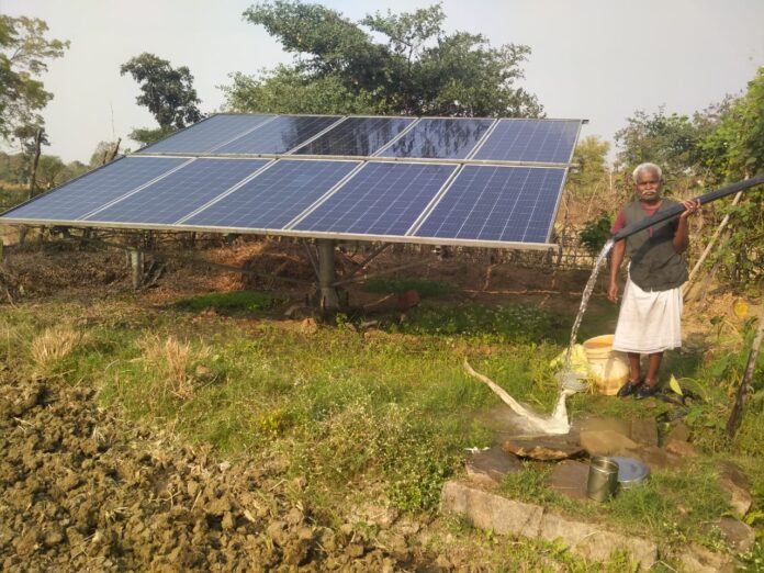 बिलासपुर। छत्तीसगढ़ शासन की सौर सुजला योजना का लाभ ले रहे बिल्हा ब्लॉक के लिम्हा गांव के किसान तिरथ राम अब बेहद खुश है। योजना के तहत मिली सोलर पम्प के माध्यम से अपने खेतों में धान के अलावा फसल चना, गेहूं व मसूर की खेती कर अन्य किसानों के लिए प्रेरणा बन रहे है। तिरथ राम ने बताया कि शासन से मिले सोलर पम्प द्वारा पूरे दिन आसानी से सिंचाई हो जाती है। बिजली बिल की चिंता से अब पूरी तरह से मुक्ति मिल गई है। निरंतर पानी की सुविधा मिलने से उत्साहित होकर अब वे धान के साथ-साथ गेहूं, चना, मसूर जैसी फसलों की तरफ भी रूचि दिखा रहे हैं।