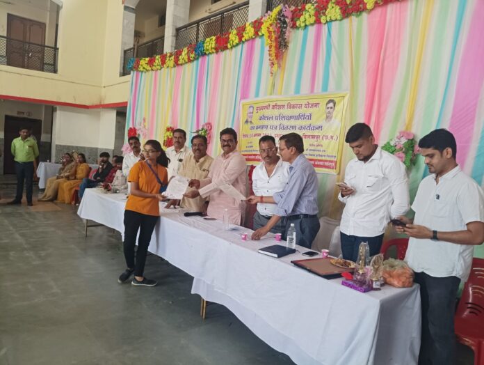 वासु सोनी, बिलासपुर। अंत्यावसायी व्यवसायिक प्रशिक्षण केन्द्र एवं युवा विकास एवं जनकल्याण संस्था रतनपुर द्वारा मुख्यमंत्री कौशल विकास योजनांतर्गत कौशल प्रशिक्षणार्थियों का प्रमाण-पत्र वितरण कार्यक्रम दिनांक 10 अगस्त 2023 को महामाया मंदिर परिसर में आयोजित हुआ। कार्यक्रम के मुख्य अतिथि अटल श्रीवास्तव, अध्यक्ष छत्तीसगढ़ पर्यटन मंडल, विशिष्ट अतिथि अभय नारायण राय उपाध्यक्ष अरपा बेसिन विकास प्राधिकरण, पूर्व ब्लाॅक अध्यक्ष आनंद जायसवाल उपस्थित थे। अतिथियों के द्वारा कौशल प्रशिक्षण प्राप्त विद्यार्थियों को प्रमाण पत्र प्रदान किया गया।