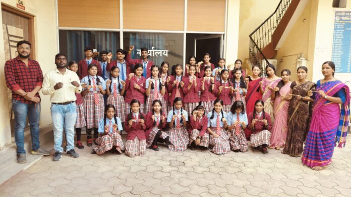 जांजगीर चांपा। आपरेशन रक्षासूत्र के तहत 1,11,111 राखियॉ और चुटकी भर गांव की मिट्टी भेजने के पूर्व सैनिक महासभा छत्तीसगढ़ के संकल्प में ज्ञानज्योति उमावि के छात्र छात्राओं तथा शिक्षकों ने पूरे मनोभाव और उत्साह से भागीदारी समर्पित की। सेना पर तैनात सैनिक भाईयो के लिए बहुत सुंदर राखियां बनाई गयीं , विद्यालय प्रशासन के माध्यम से राखियों के साथ हर लिफाफे में शहर की एक चुटकी मिट्टी देश की रक्षा में तैनात सैनिकों के लिए बहनों ने स्नेह और गर्व के साथ पूर्व सैनिक महासभा को दिये।