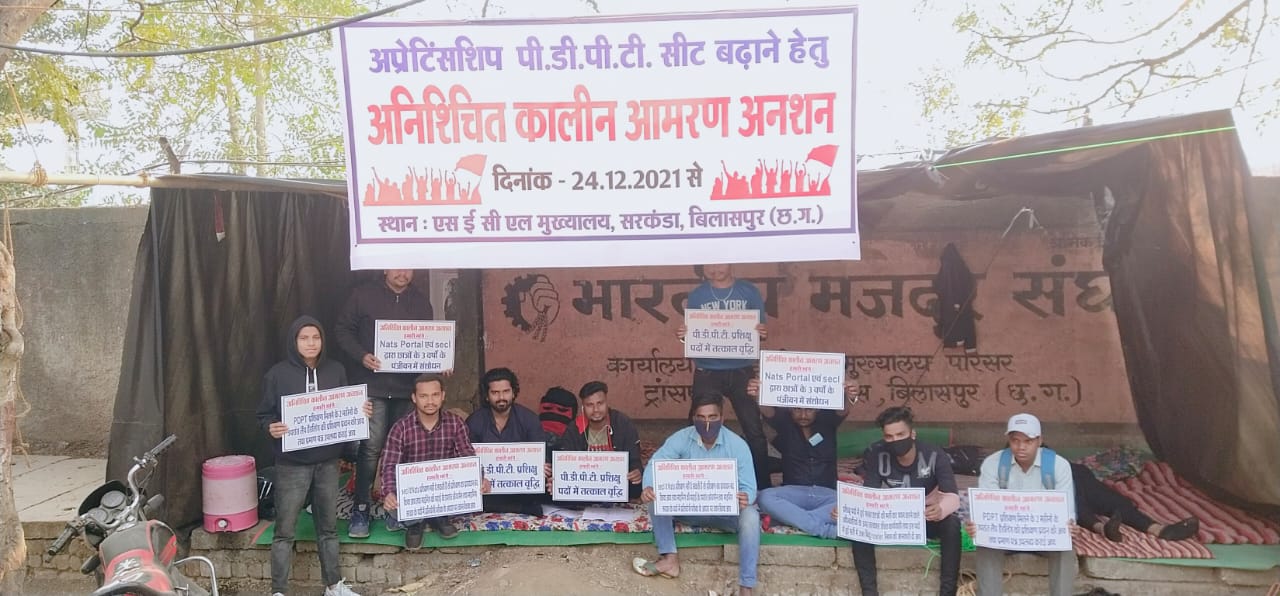अप्रेंटिसशिप की सीट बढ़ाने की मांग को लेकर एसईसीएल के मुख्य गेट के सामने बैठे हुए है। लेकिन उनकी सुनने वाला कोई नही है। वही एसईसीएल के कुछ अधिकारी युवा छात्रों से अनशन बंद करने मिन्नते भी कर रहे है लेकिन युवा छात्र अपनी मांगों को लेकर दिन रात ठंड का सामना करते बैठे है।
