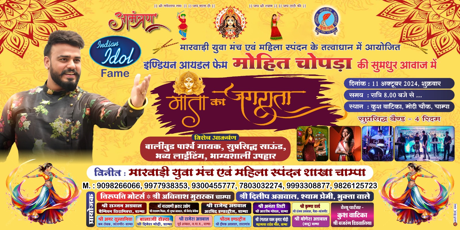 जांजगीर चाम्पा। जिले के चांपा नगर मे भी मारवाड़ी युवा मंच चांपा के बैनर तले राज गरबा का आयोजन किया जा रहा है, जिसमें 9 अगस्त को आयोजन समिति द्वारा किया गया है इसके पश्चात 11 को माता जगराता कार्यक्रम रखा गया है।जिसमें अपनी प्रस्तुति देने आ रहे हैं मुंबई के इंडियन आईडल के फेम मोहित चोपड़ा की सुमधुर आवाज में करेंगे भव्य माता जगराता एवं माई का जस गीत उनकी प्रस्तुति देखने दूर-दूर से लोग आते हैं, बता दें कि समिति के समिति के लोग तैयारी में जुटे हुए हैं तो वहीं समिति के सदस्य व कार्यक्रम प्रभारी प्रकाश अग्रवाल ने बताया कि मोहित चोपड़ा को इस बार के जस गीत में बुलाया गया है जिसको लेकर समिति में काफी उत्साह देखने को मिल रहा है वह काम का बंटवारा कर लिया गया है साथ ही सभी अपनी तैयारी में लगे हुए हैं। इसके अलावा कार्यक्रम में सुप्रसिद्ध बैंड 4 रिदम जो कि देश प्रसिद्ध है अपनी प्रस्तुति देंगे रास गरबा में कई बड़े गायक शिकस्त करेंगे और अपनी प्रस्तुति से लोगों का मन मोह लेंगे । आयोजन समिति द्वारा निरंतर नवरात्रि के अवसर पर कराया जाता आ रहा है जो कि आज भी जारी है समिति के लोगों ने सभी से अपील की है की कुश वाटिका ,मोदी चौक चांपा में 11 को होने वाले माता जगराता में सभी बढ़ चढ़कर हिस्सा लेकर अपनी सहभागिता निभाएंगे।
