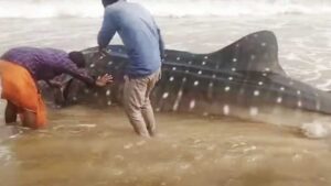 जिले के सुनापुर बीच पर सोमवार को एक 15 फीट लंबी ब्लू व्हेल शार्क की मौत हो गई. यह घायल व्हेल शार्क समुद्र की लहरों के साथ बहकर तट पर आ गई थी. स्थानीय मछुआरों ने इसे समुद्र में वापस भेजने की पूरी कोशिश की, लेकिन असफल रहे. आखिरकार, समुद्र तट पर करीब तीन घंटे तक फंसे रहने के बाद इस विशाल जीव ने दम तोड़ दिया.