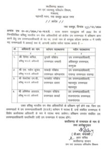 छत्तीसगढ़ राज्य सरकार ने 2022 बैच के ट्रेनी भारतीय वन सेवा अधिकारियों को प्रशिक्षण के लिए विभिन्न वनमण्डलों में उप-वनमण्डलाधिकारी के पद पर नियुक्त किया है. इनमें दुगली वन परिक्षेत्र के दिपेश कपिल, माकड़ी वन परिक्षेत्र के नवीन कुमार, माचकोट वन परिक्षेत्र के वेंकटेशा एम.जी. और रेंगाखार वन परिक्षेत्र के अभिषेक शामिल हैं.