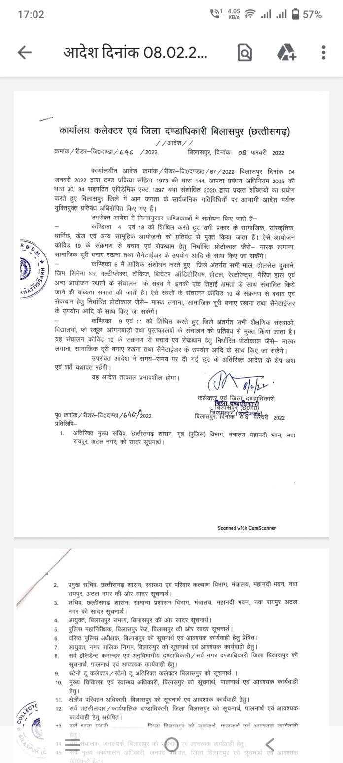 बिलासपुर – कलेक्टर डॉ सारांश मित्तर ने मंगलवार को अधिकारियों से चर्चा के बाद जिले में कोरोनावायरस के मद्देनजर लगाए गए तमाम प्रतिबंधों को समाप्त कर दिया है। पुराने आदेशों में संशोधन करते हुए छोटे बच्चों से लेकर स्कूल कॉलेज तक सभी खोल दिए गए।