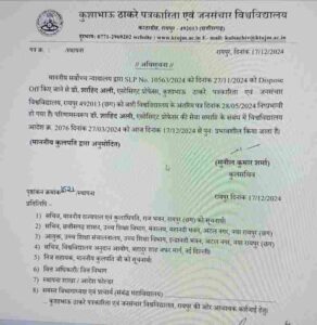 कुशाभाऊ ठाकरे पत्रकारिता विश्वविद्यालय के प्रोफेसर डॉ. शाहिद अली की सेवा समाप्त कर दी गई है. इसका आदेश उच्चतम न्यायालय के निर्णय के आधार पर विश्वविद्यालय ने जारी किया है. शाहिद अली जनसंचार विभागाध्यक्ष थे.