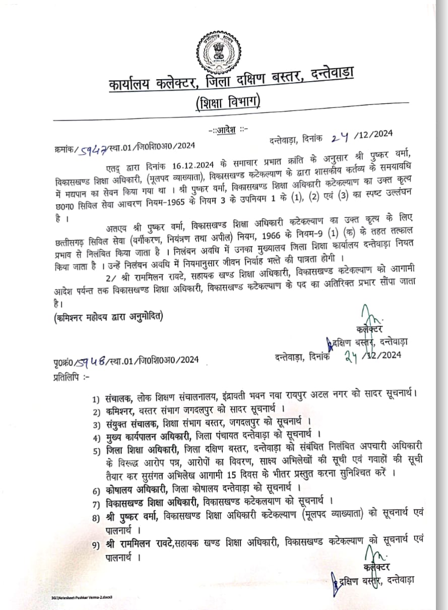निलंबन अवधि में बीईओ पुष्कर वर्मा (मूल पद व्याख्याता) का मुख्यालय जिला शिक्षा अधिकारी कार्यालय दंतेवाड़ा नियत किया गया है, वहीं उन्हें जीवन निर्वाह भत्ते की पात्रता होगी।