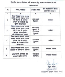 इसी तरह जिला पंचायत अध्यक्ष पद के आरक्षण की सूचना 3 जनवरी को प्रकाशित होगी, और 11 जनवरी को आरक्षण की कार्यवाही संपन्न करते हुए जानकारी दी जाएगी. पहले यह प्रक्रिया 23 दिसंबर से शुरू होकर 30 दिसंबर को संपन्न होनी थी.