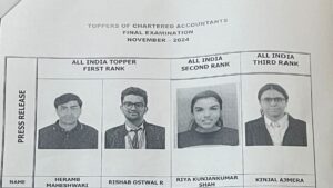 ICAI CA नवंबर फाइनल परीक्षा 2024 में हैदराबाद के हेरंब माहेश्वरी और तिरुपति के ऋषभ ओस्टवाल ने टॉप किया है. दोनों ने 84.67 फीसदी अंक पाकर फर्स्ट रैंक हासिल की है. वहीं, दूसरे स्थान पर अहमदाबाद की रिया कुंजन कुमार शाह रही हैं। उन्होंने 83.50 फीसदी अंक हासिल हुए हैं. तीसरा स्थान कोलकाता की किंजल अजमेरा को मिला है। उन्होंने 82.17 प्रतिशत अंक प्राप्त हुए हैं.