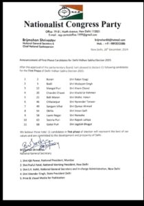 बुराड़ी से रतन त्यागी, चांदनी चौक से खालिद उर रहमान, बल्ली मारन से मोहम्मद हारुन और ओखला से इमरान सैफी को पार्टी की पहली लिस्ट में शामिल किया गया है. गोकुलपुरी से जगदीश भगत, मंगोलपुरी से खेम चंद, लक्ष्मी नगर से नमहा, सीमापुरी से राजेश लोहिया, छतरपुर से नरेंद्र तंवर, और संगम विहार से कमर अहमद को मैदान में उतारा गया है. वहीं, NCP ने बादली विधानसभा सीट से मुलायम सिंह को मैदान में उतारा है, जहां से दिल्ली कांग्रेस प्रमुख देवेंद्र यादव चुनाव लड़ रहे हैं.