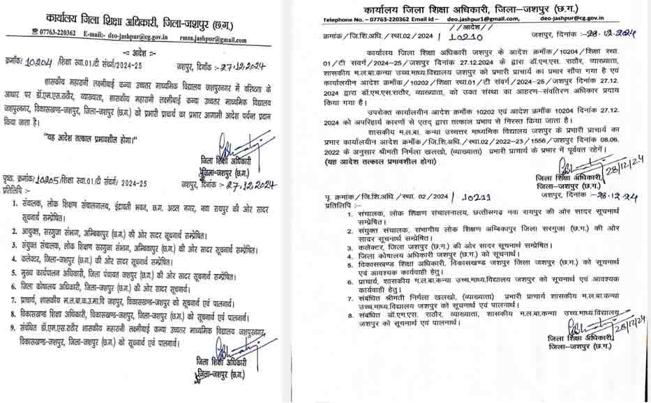 जिले के नामचीन म ल बा उच्चतर माध्यमिक विद्यालय जशपुर के प्राचार्य को हटाकर दूसरे प्राचार्य को प्रभार दे दिया गया लेकिन रातों रात आदेश बदल गया और उसी प्राचार्य को पुनः पदस्थ कर दिया गया।