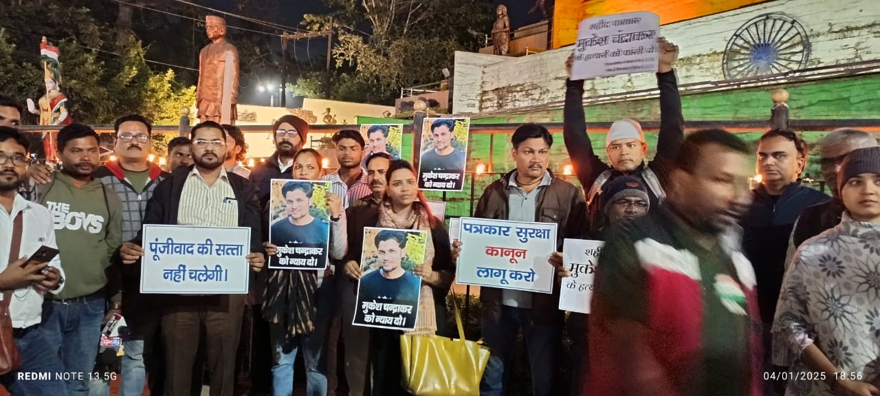 बस्तर बीजापुर के युवा पत्रकार मुकेश चंद्राकर की जघन्य हत्या से समाज के सभी वर्ग में आक्रोश नजर आ रहा है। रविवार की दोपहर मौन जुलूस निकालकर सीएम के नाम ज्ञापन सौंपने के बाद बिलासपुर प्रेस क्लब की अगुवाई में देवकीनंदन दीक्षित चौक से सदर बाजार तक कैंडल मार्च निकाला गया।