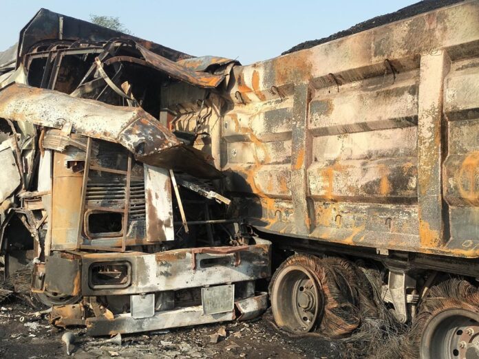 पेट्रोल-डीजल से भरे टैंकर ने कोयला लोड हाइवा को टक्कर मारी, जिससे आग लग गई।