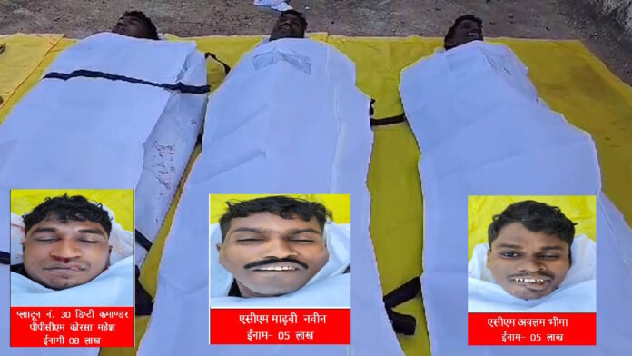 मुठभेड़ समाप्ति उपरांत सभी टीमों द्वारा सर्च करने पर तीन पुरुष हार्डकोर माओवादियों का शव हथियार सामग्री सहित बरामद हुआ. इनमें से पश्चिम बस्तर बीजापुर क्षेत्र निवासी कोरसा महेश पर 8 लाख रुपए, पश्चिम बस्तर बीजापुर निवासी माडवी नवीन उर्फ कोसा एसीएम पर 5 लाख और जोनागुड़ा थाना जगरगुण्डा जिला सुकमा निवासी अवलम भीमा एसीएम पर भी पांच लाख रुपए का ईनाम था.